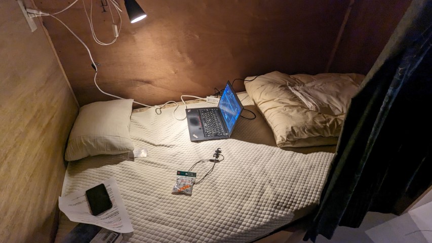 ただし,二段ベッドということもあり,物音や光は結構はいってくるので,敏感な人はアイマスクや耳栓を用意しておくのがオススメです。 参加者の中にもあまり寝られなくて大変だった……と言っている人がいました。