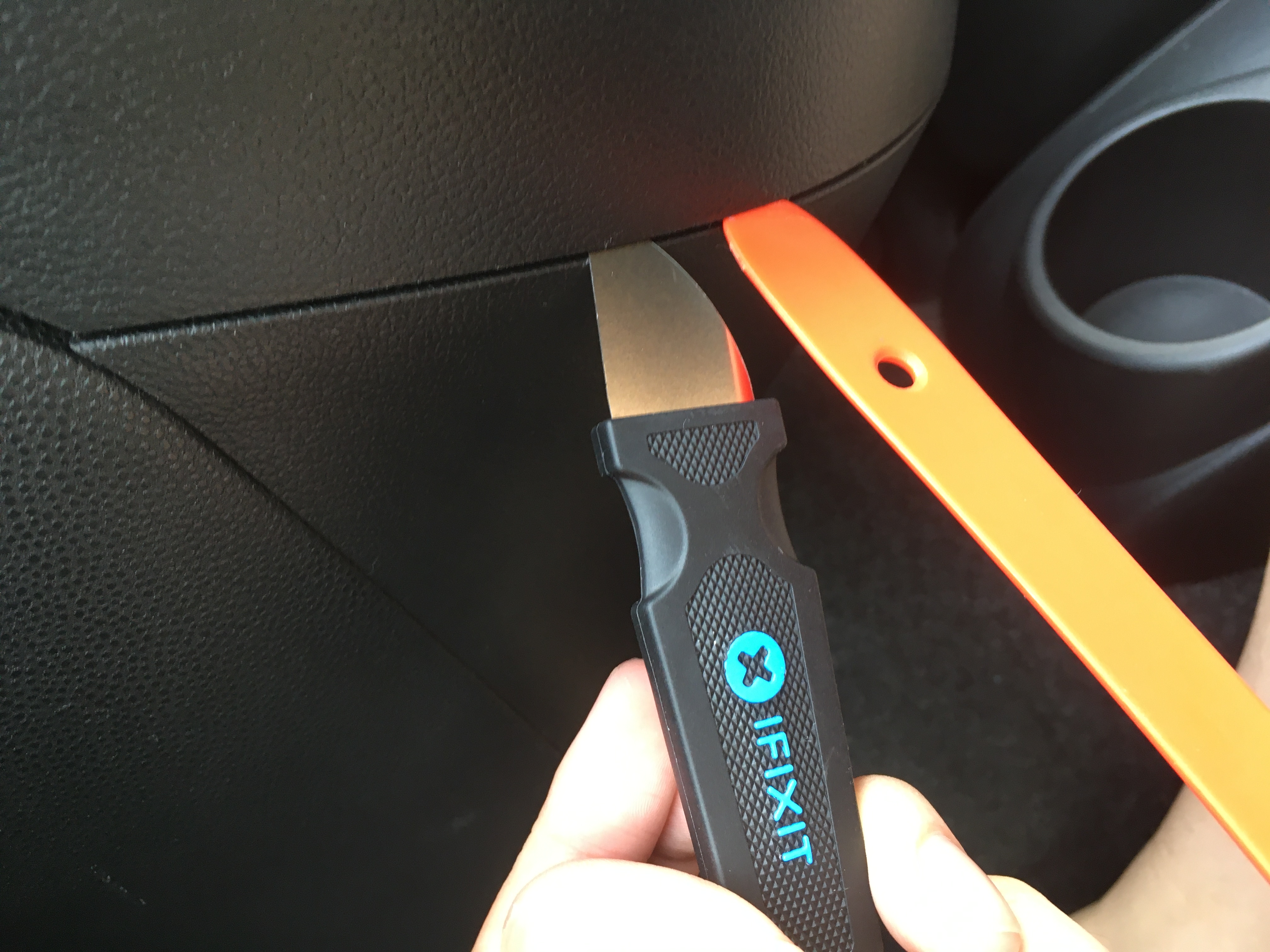 隙間がほとんどなく,内装剥がしが入らなくて苦戦したのですが,ふと思いついてiFixitのスマホオープナー「Jimmy」で少しだけシフトカバーを持ち上げ,できた隙間にすかさず内装剥がしを突っ込むようにすると,すんなり外れました。
